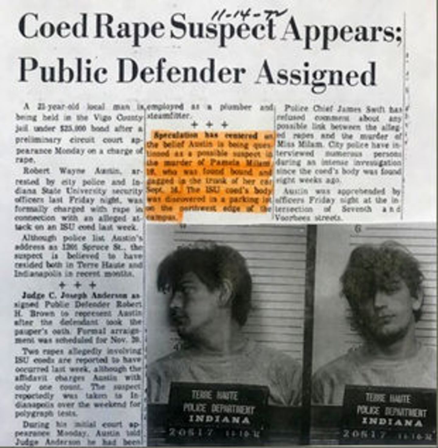 No real suspect was identified until seven weeks later, when a man named Robert Wayne Austin was arrested in connection with a string of abductions and rapes on the ISU campus. Austin abducted the other women and took them to a secluded area off campus, where he raped them. He then returned them to the university.