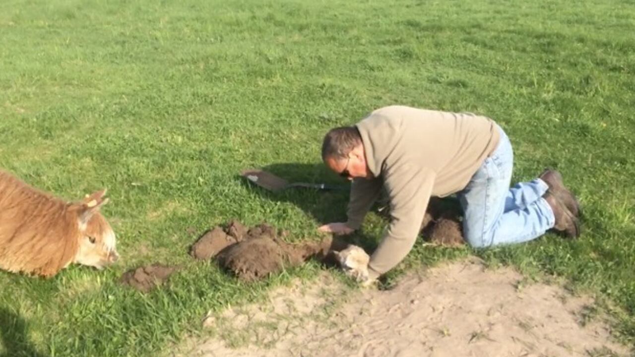 MENOMONIE, Wis. — A baby alpaca got itself into a tight spot while apparently trying to take a dust bath.