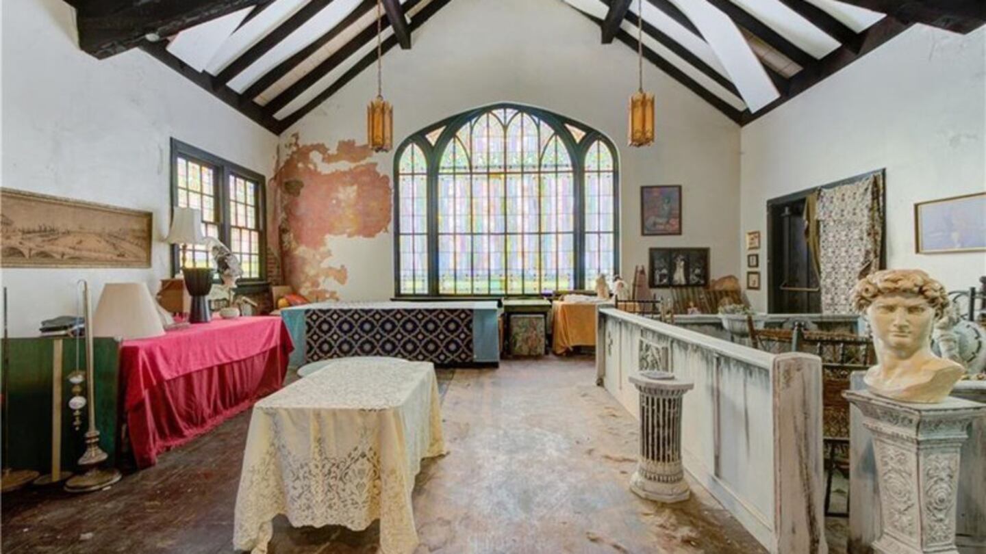 From the outside, this former church built in 1925 is nothing short of spooksville. Gravestones serve as faux lawn ornaments, a wooden russet fence hides away sections of the building, and “99 percent intact” stained-glass windows seem to watch any activity that passes by.