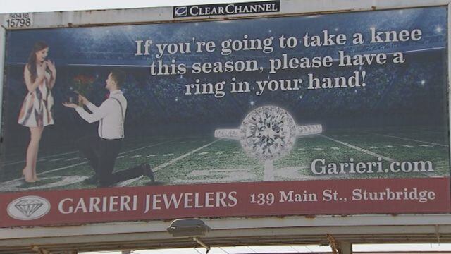 Garieri Jewelers set up an ad on a billboard along Route 20 in Charlton on Saturday depicting a young man down on one knee on a football field proposing to a woman.