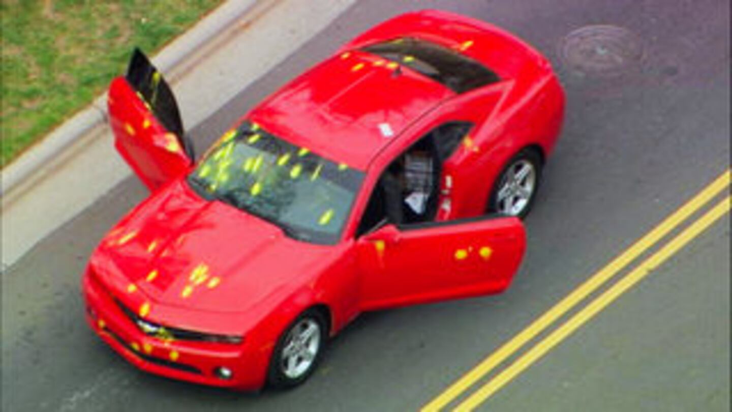 A red Chevrolet Camaro was covered with yellow dots of paint on Arrowood Road while around the corner a gray sedan