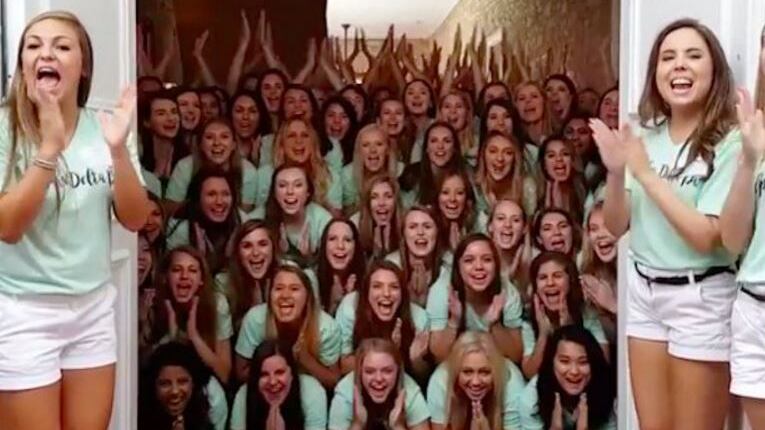 The video shows three sorority members welcoming potential recruits to the house then opening the doors to reveal at least 50 more girls chanting their house-specific cheer. Not to mention everyone in the video is wearing the same white shorts, sea-foam green shirts and are all moving up and down in unison.
