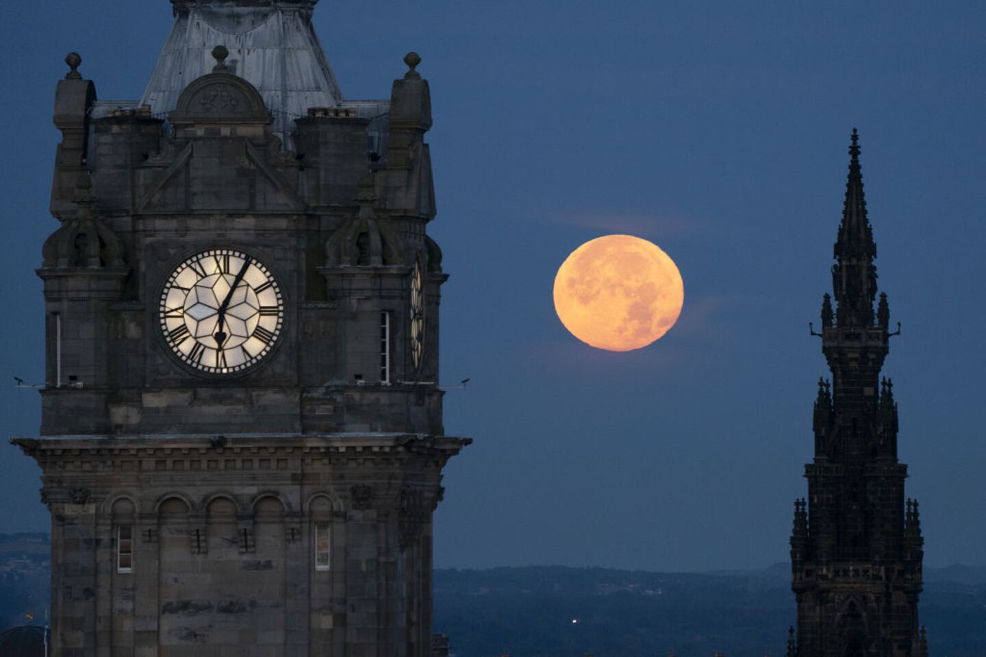 Blue Supermoon The super blue moon sets between the Balmoral Clock and the Scott Monument in Edinburgh. The blue moon refers to the second full moon in one calendar month, which occurs approximately once every two or three years. This one is also supermoon - when the Earth's natural satellite will appear about 14% bigger and 30% brighter in the sky as it reaches its closest point to Earth. Picture date: Thursday August 31, 2023. (Photo by Jane Barlow/PA Images via Getty Images) (Jane Barlow - PA Images/PA Images via Getty Images)