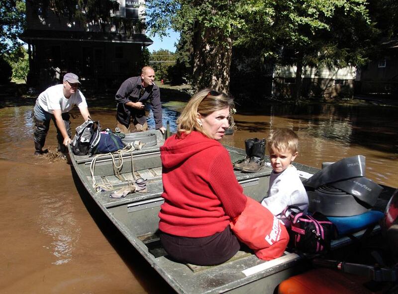 Mark Hackman, and his brother Mike Hackman push Mike's wife Lori Hackman and son Sammy Hackman in a boat through flood waters. Rain from Hurricane Ivan caused the worst flooding along the Delaware River in 50 years. (William Thomas Cain/Getty Images)