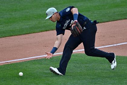 2023 All-Star Game: Atlanta's Austin Riley barehands a ground ball during the fifth inning of Tuesday night's All-Star Game. (Alika Jenner/Getty Images)