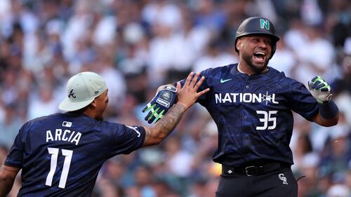 2023 All-Star Game: Orlando Arcia of the Atlanta Braves reacts during the All-Star Game. (Tim Nwachukwu/Getty Images)