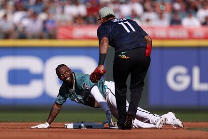 2023 All-Star Game: Randy Arozarena of the Tampa Bay Rays is tagged out by Atlanta's Orlando Arcia. (Steph Chambers/Getty Images)