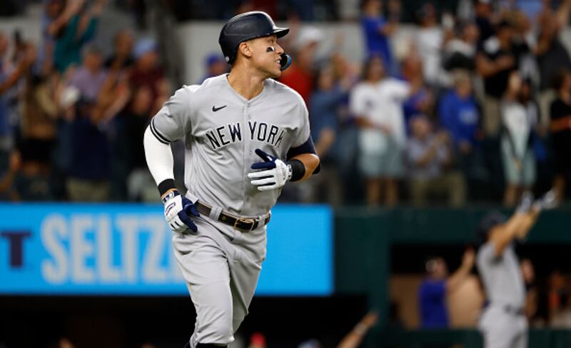 Photos: Aaron Judge hits 62nd home run to set AL record Aaron Judge of the New York Yankees smiles as he rounds the bases after hitting his 62nd home run of the season against the Texas Rangers during the first inning in game two of a double header at Globe Life Field on October 4, 2022, in Arlington, Texas. Judge has now set the American League record for home runs in a single season. (Ron Jenkins/Getty Images)