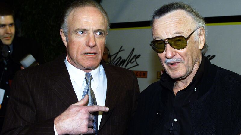2000 US actor James Caan (L) greets Stan Lee (R), the creator of the Marvel Comics characters Spider Man and the Incredible Hulk, at Lee's 60th Anniversary in Entertainment Gala in Hollywood, CA 29 February, 2000. (LUCY NICHOLSON/AFP via Getty Images)