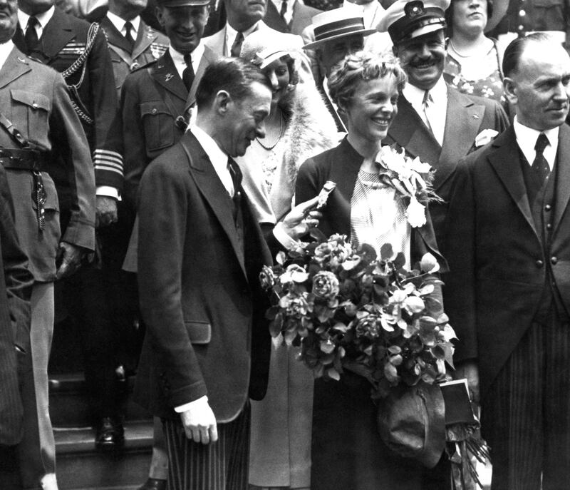 Photos: Amelia Earhart through the years 1932: Amelia Earhart, the transatlantic flyer, is shown in Cherbourg, France, on June 10, 1932, when she arrived there to meet her husband, George Palmer Putnam, the publisher, who went over to Europe to join her after her transatlantic flight. Miss Earhart is being presented with a bouquet by M. Quonium, president of the chamber of commerce there. Putnam is at her left. (AP Photo)
