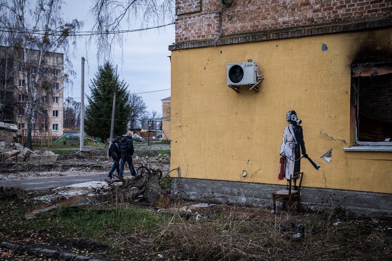 Key Infrastructure Attacked, Leaving Kyiv With Further Power And Water Outages HOSTOMEL, UKRAINE - NOVEMBER 12: Street art of a person in a dressing gown holding a fire extinguisher and wearing a gas mask is painted on a wall of a destroyed building in Hostomel near Antonov Airport on November 12, 2022 in Kyiv Region, Ukraine. On November 11 2022, the artist Banksy announced that he had made similar art work in Borodyanka, also in Kyiv region. Civilian houses and buildings were badly damaged during the fierce fighting as the Antonov Airpot was temporarily captured by Russian forces at the start of Russias full scale invasion of Ukraine. Electricity and heating outages across Ukraine caused by missile and drone strikes to energy infrastructure have added urgency to preparations for winter. (Photo by Ed Ram/Getty Images) (Ed Ram/Getty Images)