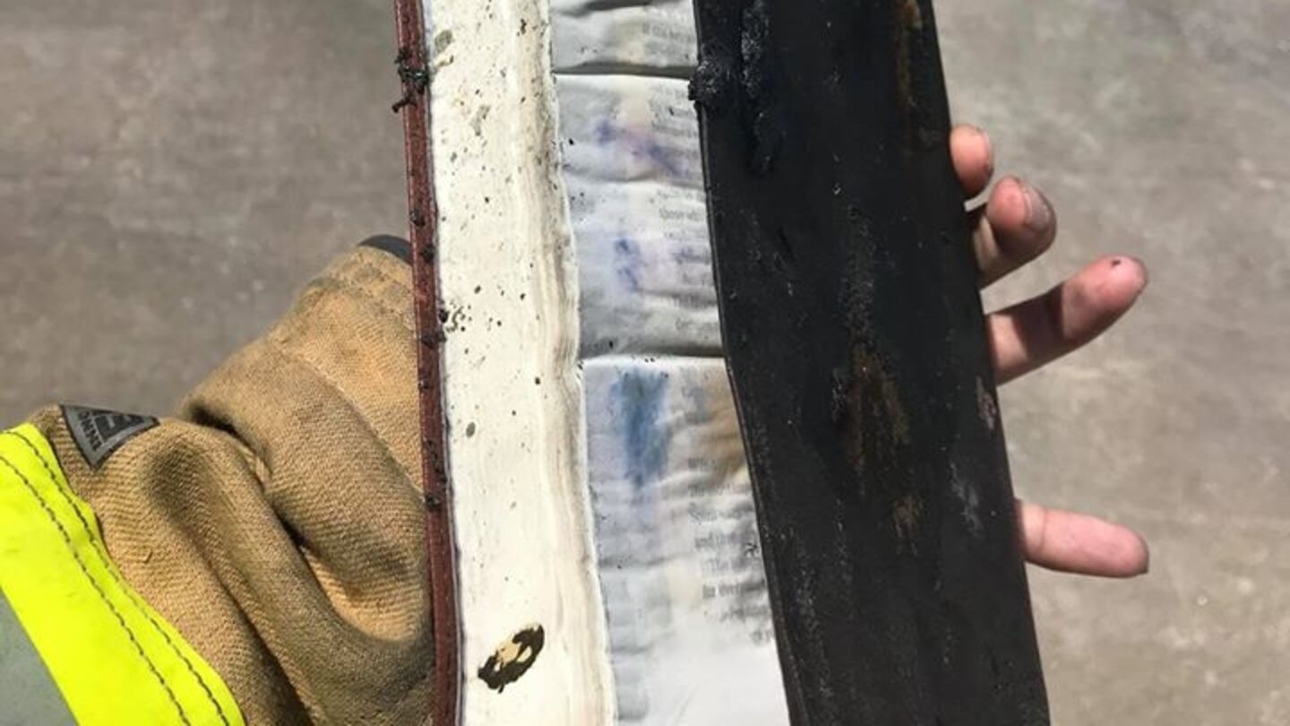 As they were searching the truck, they found the Bible on the dashboard, and aside from some water on the pages and slight damage to the back cover, it was spared from the flames.