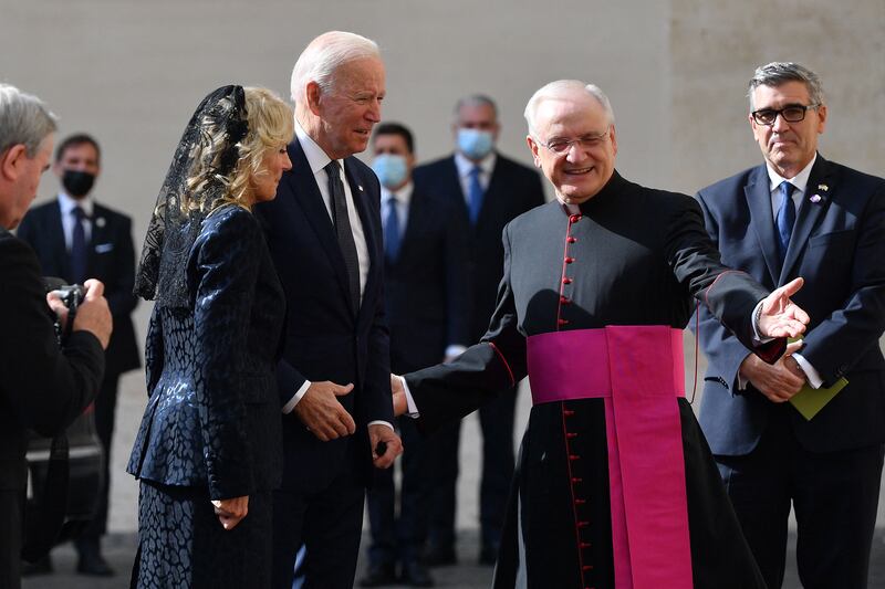 Photos: Biden arrives at Vatican for meeting with Pope Francis Monsignor Leonardo Sapienza, Italian priest, greets President Joe Biden as he arrives at San Damaso courtyard in the Vatican on October 29, 2021, for a private audience with the Pope. (TIZIANA FABI/AFP via Getty Images)
