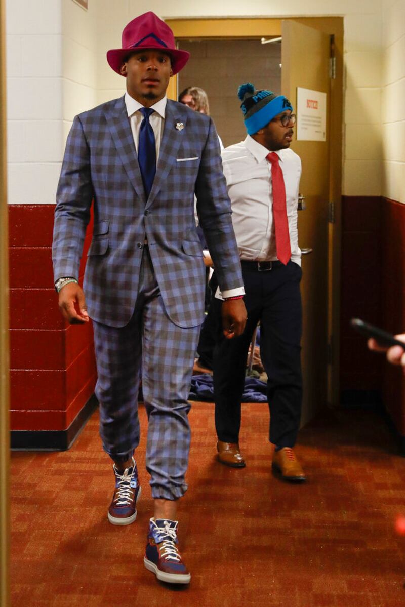 Cam Newton through the years Carolina Panthers quarterback Cam Newton wears bracelets, a watch, and a monogrammed shirt cuff with his suit coat during a post-game press conference after an NFL football game against the Seattle Seahawks, Sunday, Oct. 18, 2015, in Seattle. (AP Photo/Stephen Brashear) (Stephen Brashear/AP)