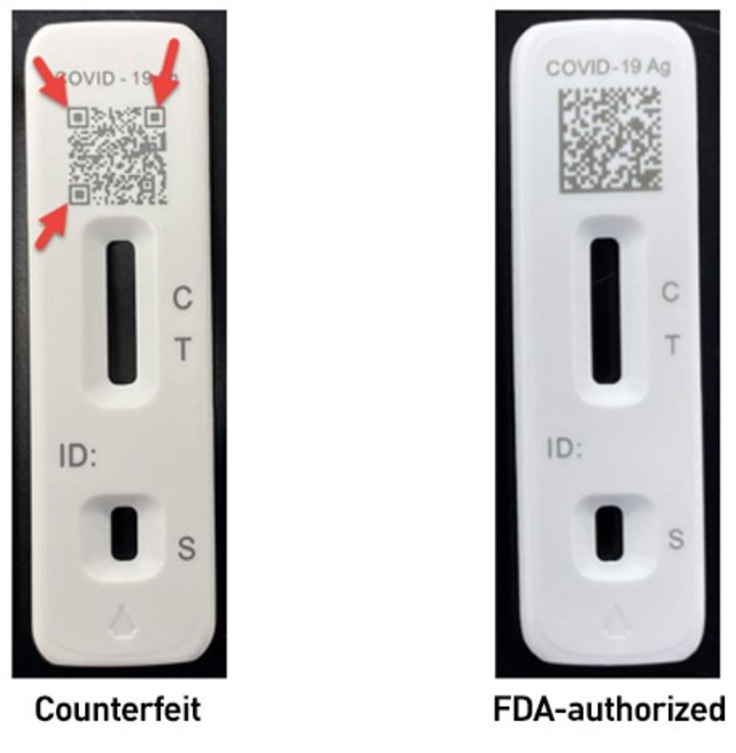 The counterfeit products will not have the lot number/expiration date/2D-datamatrix label that should be found on the test packaging.