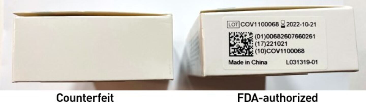 The FDA said that it had also identified counterfeit iHealth COVID-19 Antigen Rapid Test Kits. The FDA said it is working with iHealth on how to best identify the counterfeit tests, but gave these suggestions of things to look for when determining whether a test is real or counterfeit: