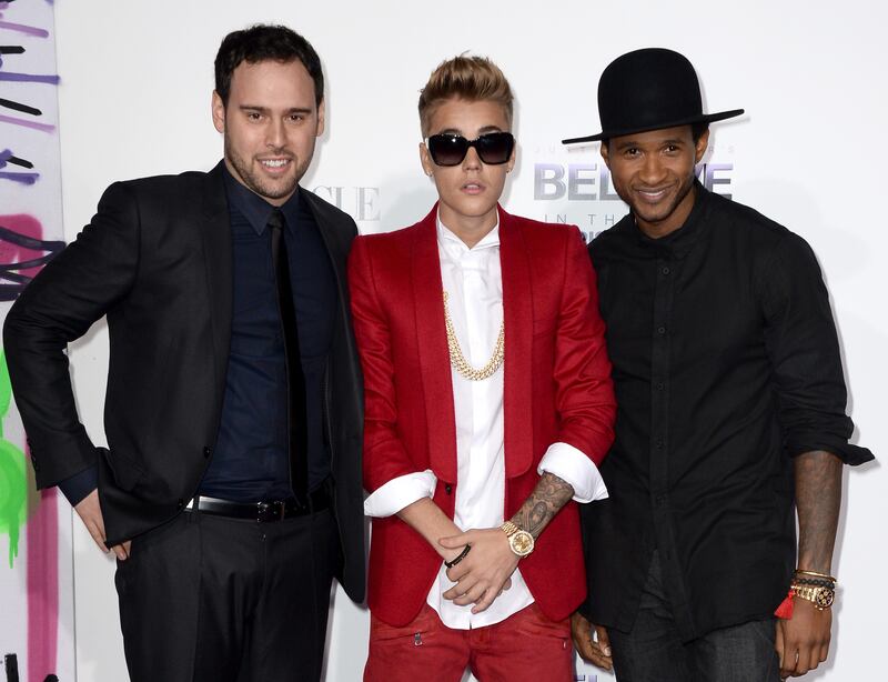 Premiere Of Open Road Films' "Justin Bieber's Believe" - Arrivals LOS ANGELES, CA - DECEMBER 18: (L-R) Producer Scooter Braun, singer/producer Justin Bieber and producer Usher arrive at the premiere of Open Road Films' "Justin Bieber's Believe" at Regal Cinemas L.A. Live on December 18, 2013 in Los Angeles, California. (Photo by Frazer Harrison/Getty Images) (Frazer Harrison/Getty Images)