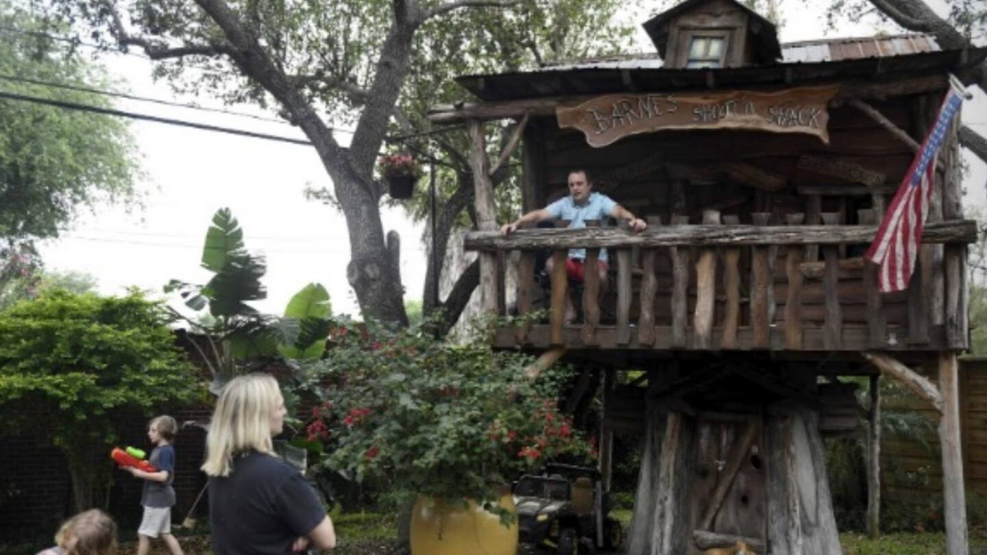 Barnes has spent nearly three weeks in the treehouse, the Corpus Christi Caller-Times reported. He shouts down to two sons, ages 6 and 9, and sometimes will go to the glass door of their home when he needs something.