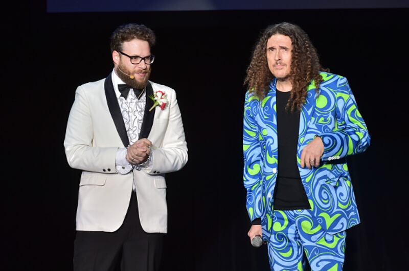Photos: 'Weird Al' Yankovic through the years 2014: Actor Seth Rogen and Weird Al Yankovic on stage at the third annual Hilarity for Charity Variety Show to benefit the Alzheimer's Association, presented by Genworth, at Hollywood Palladium on October 17, 2014, in Hollywood, California. (Michael Buckner/Getty Images for Hilarity For Charity)