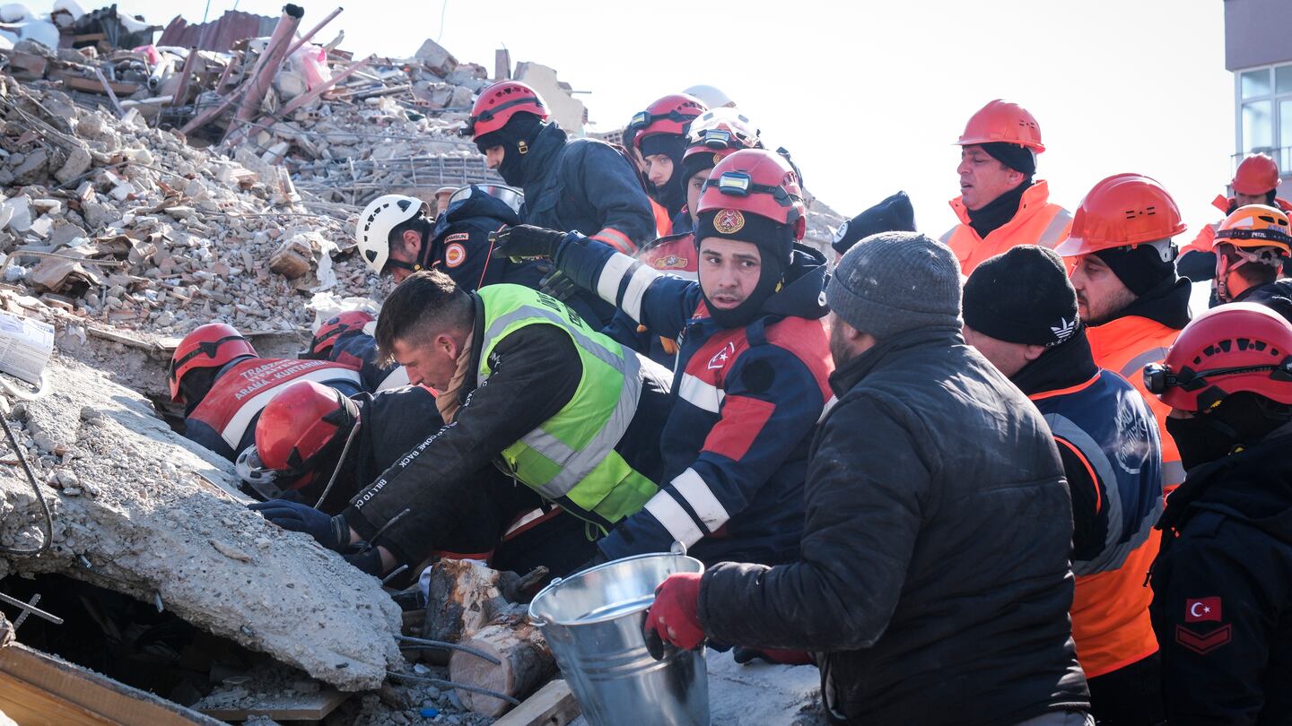 Thousands Dead After Earthquake Hits Turkey And Syria ELBISTAN, TURKEY - FEBRUARY 09: Rescue teams, firemen and volunteers work on a collapsed building to evacuate a victim on February 9, 2023 in Elbistan, Turkey. A 7.8-magnitude earthquake hit near Gaziantep, Turkey, in the early hours of Monday, followed by another 7.5-magnitude tremor just after midday. The quakes caused widespread destruction in southern Turkey and northern Syria and were felt in nearby countries. (Photo by Mehmet Kacmaz/Getty Images) (Mehmet Kacmaz/Getty Images)