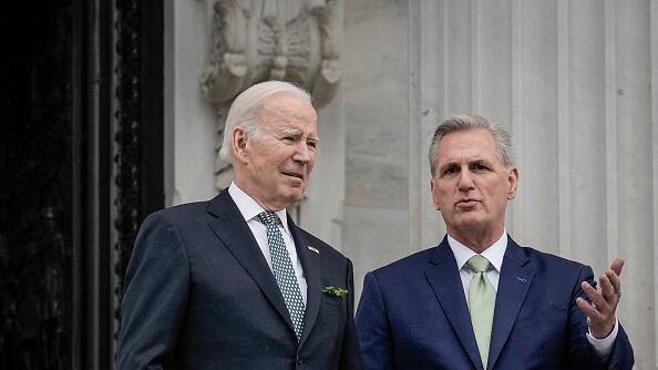 Speaker McCarthy, President Biden come to agreement on WASHINGTON, DC - MARCH 17: (L-R) U.S. President Joe Biden and Speaker of the House Kevin McCarthy (R-CA) talk as they depart the U.S. Capitol following the Friends of Ireland Luncheon on Saint Patrick's Day March 17, 2023 in Washington, DC. (Photo by Drew Angerer/Getty Images/Getty Images)