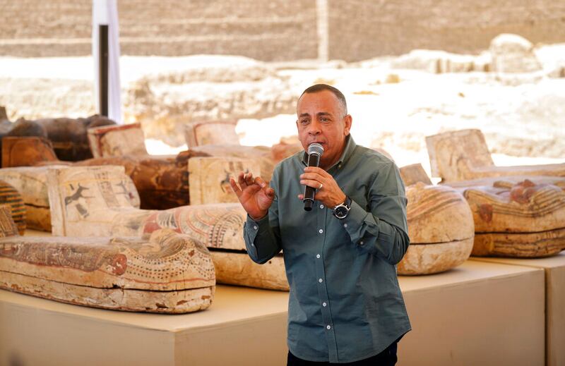 Egyptian discovery Mostafa Waziri, secretary-general of the Supreme Council of Antiquities, speaks during a press conference in front of painted coffins with well-preserved mummies inside, dating back to the Late Period of ancient Egypt around 500 B.C, at a makeshift exhibit at the feet of the Step Pyramid of Djoser in Saqqara, 24 kilometers (15 miles) southwest of Cairo, Egypt, Monday, May 30, 2022. (AP Photo/Amr Nabil) (Amr Nabil/AP)