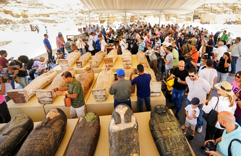 Egyptian discovery Painted coffins with well-preserved mummies inside, dating back to the Late Period of ancient Egypt around 500 B.C, and a trove of ancient artifacts recently unearthed, are displayed during a press conference by Mostafa Waziri, secretary-general of the Supreme Council of Antiquities, at a makeshift exhibit at the feet of the Step Pyramid of Djoser in Saqqara, 24 kilometers (15 miles) southwest of Cairo, Egypt, Monday, May 30, 2022. (AP Photo/Amr Nabil) (Amr Nabil/AP)