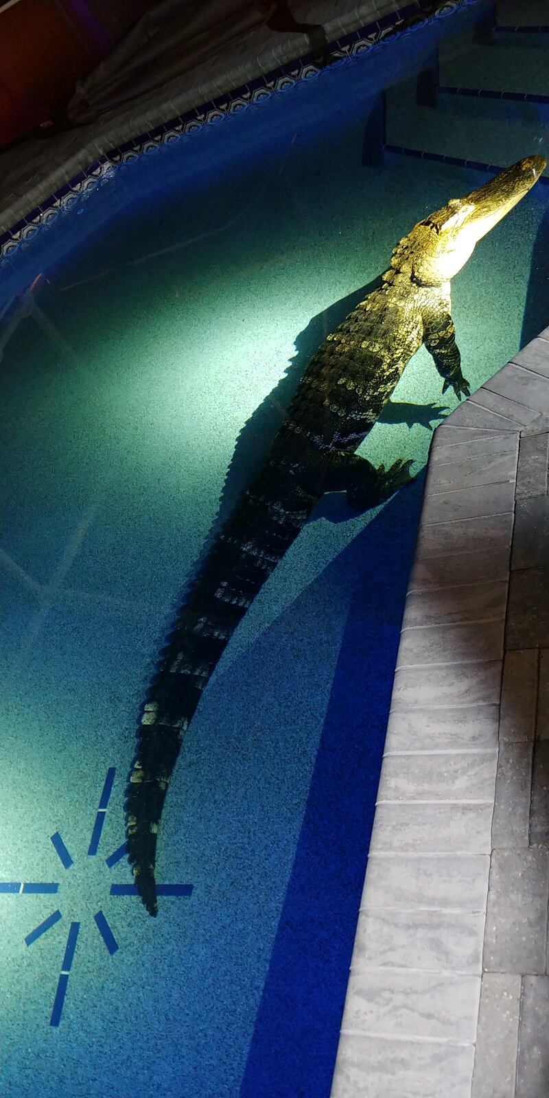 The Charlotte County Sheriff’s Office shared photos of the large reptile in a Facebook post, joking, “Water Safety Month, Tip #37: Always check your pool before diving in!”