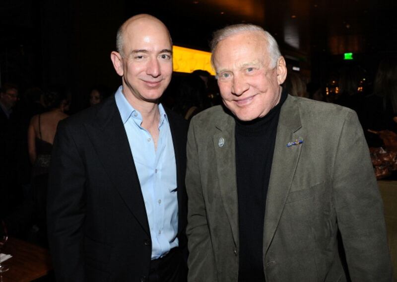 Through the years Ceo of Amazon Jeff Bezos and engineer Buzz Aldrin attend TheWrap's 3rd Annual Pre-Oscar Party at Culina Restaurant at the Four Seasons Los Angeles on February 22, 2012 in Beverly Hills, California. (Photo by Angela Weiss/Getty Images for TheWrap) (Angela Weiss)