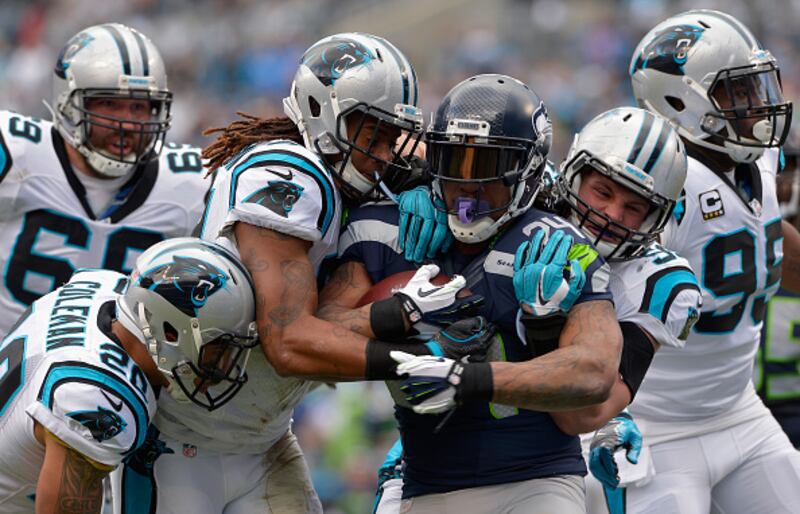 Photos: Marshawn Lynch through the years 2016: Luke Kuechly and Shaq Green-Thompson of the Carolina Panthers attempt to tackle Marshawn Lynch of the Seattle Seahawks during the NFC Divisional Playoff Game at Bank of America Stadium on January 17, 2016, in Charlotte, North Carolina. (Grant Halverson/Getty Images)