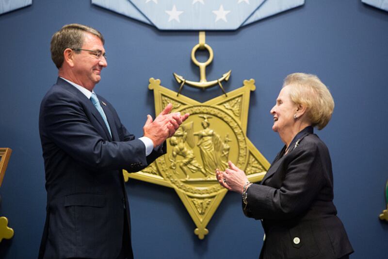 Through the years ARLINGTON, VA - JUNE 30: Secretary of Defense Ash Carter applauds after presenting former Secretary of State Madeleine Albright the Department of Defense Medal for Distinguished Public Service, on June 30, 2016 at the Pentagon in Arlington, Virginia. (Photo by Allison Shelley/Getty Images) (Allison Shelley/Getty Images)
