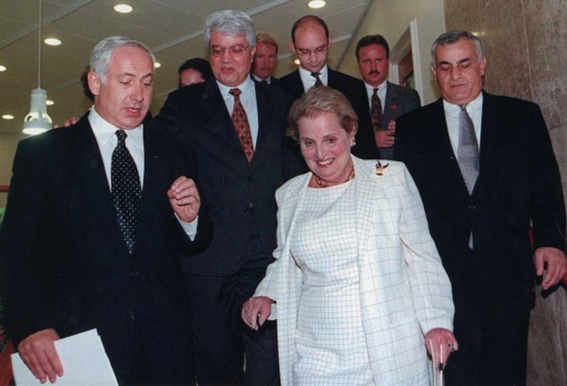 Through the years U.S. Secretary of State, Madeleine Albright, with (from left) the Israeli Prime Minister Benjamin Netanyahu, Foreign Minister David Levy and Defence Minister Yitzhak Mordechai after a three hour meeting discussing the Middle East peace talks. (Photo by Hulton Archive/Getty Images) (Hulton Archive/Getty Images)