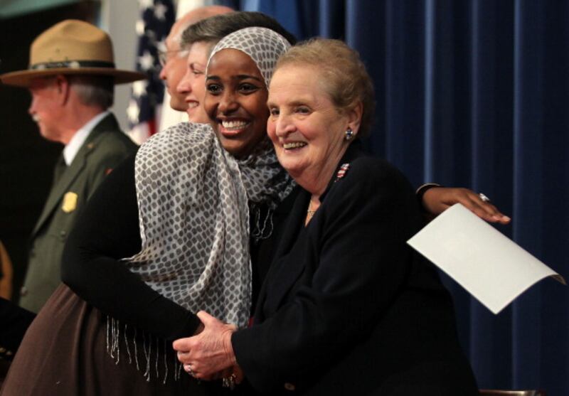 Through the years WASHINGTON, DC - SEPTEMBER 23: Ladan Mohamed (L) of Alexandria, Virginia, who was originally from Somalia, hugs former Secretary of State Madeleine Albright (R) as she was presented with her naturalization certificate during a naturalization ceremony at Department of Interior September 23, 2011 in Washington, DC. About 50 new immigrants from 29 countries participated in the ceremony to become new U.S. citizens. (Photo by Alex Wong/Getty Images) (Alex Wong/Getty Images)