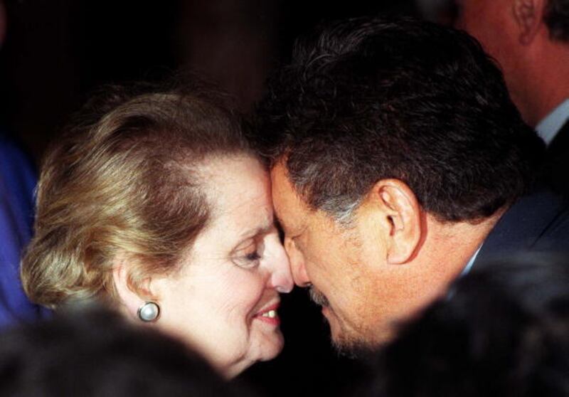 Through the years U.S. Secretary of State, Madeleine Albright, shaking hands with the Palestinian leader, Yasser Arafat, prior to holding talks aimed at restarting the Middle East peace process. (Photo by Hulton Archive/Getty Images) (Hulton Archive/Getty Images)