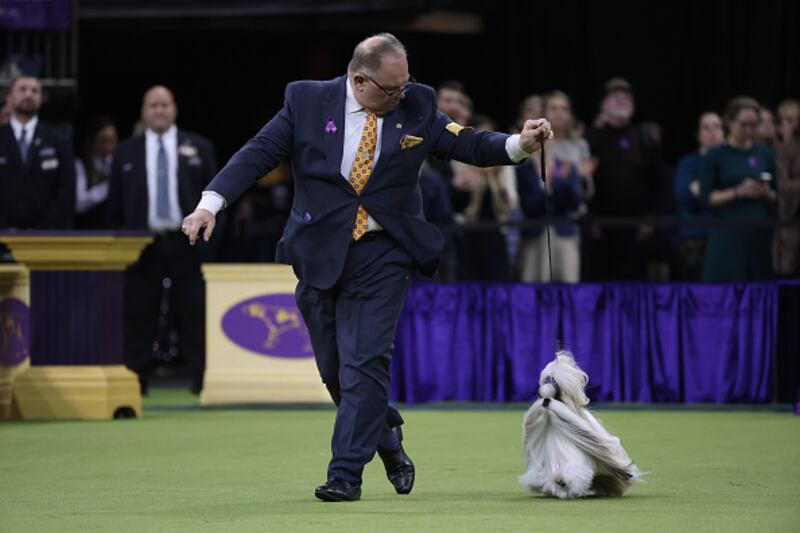 149th Annual Westminster Kennel Club Dog Show NEW YORK, NEW YORK - FEBRUARY 11: A handler walks a Shih Tzu dog during the Best in Show of the 149th Annual Westminster Kennel Club Dog Show at Madison Square Garden on February 11, 2025 in New York City. (Photo by Andres Kudacki/Getty Images) (Andres Kudacki/Getty Images)