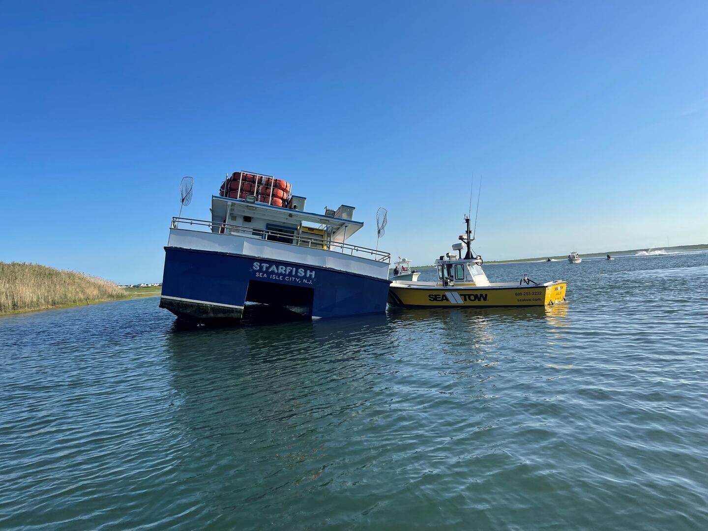 The U.S. Coast Guard shared two photos on Twitter of the listing Starfish boat, which began taking on water near Townsends Inlet Bridge. In its post, the Coast Guard said that a good Samaritan took the passengers who were on board the boat to safety.