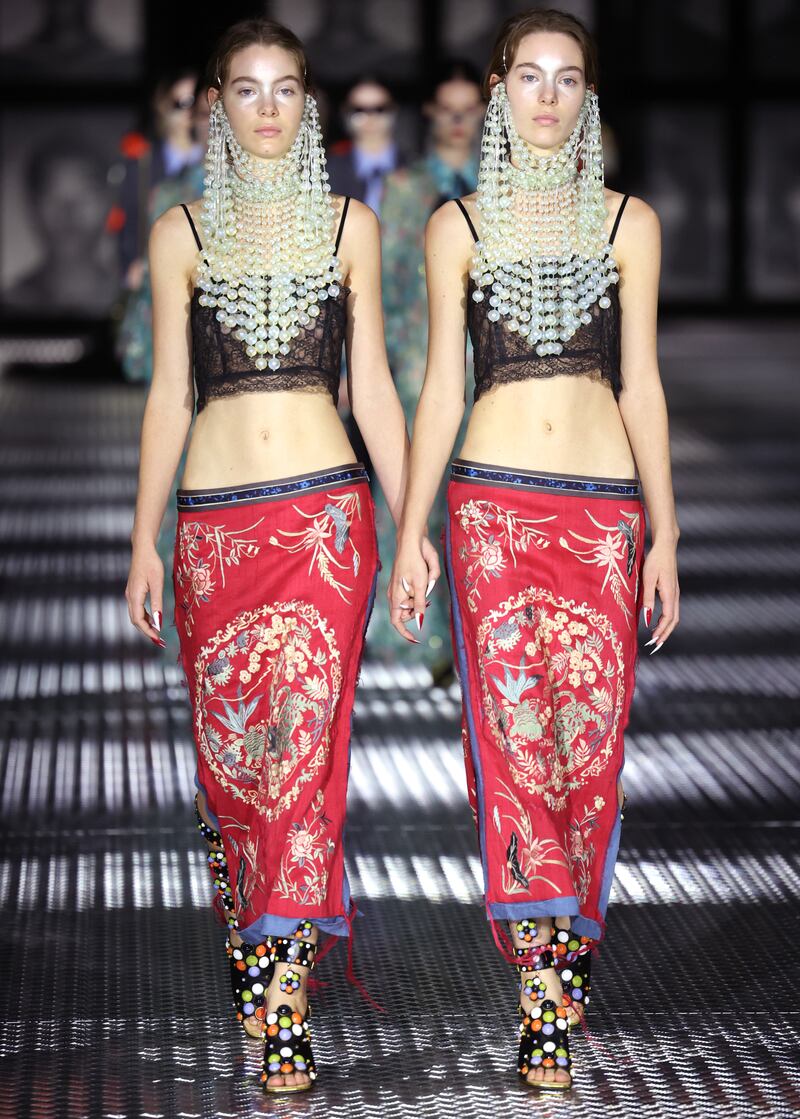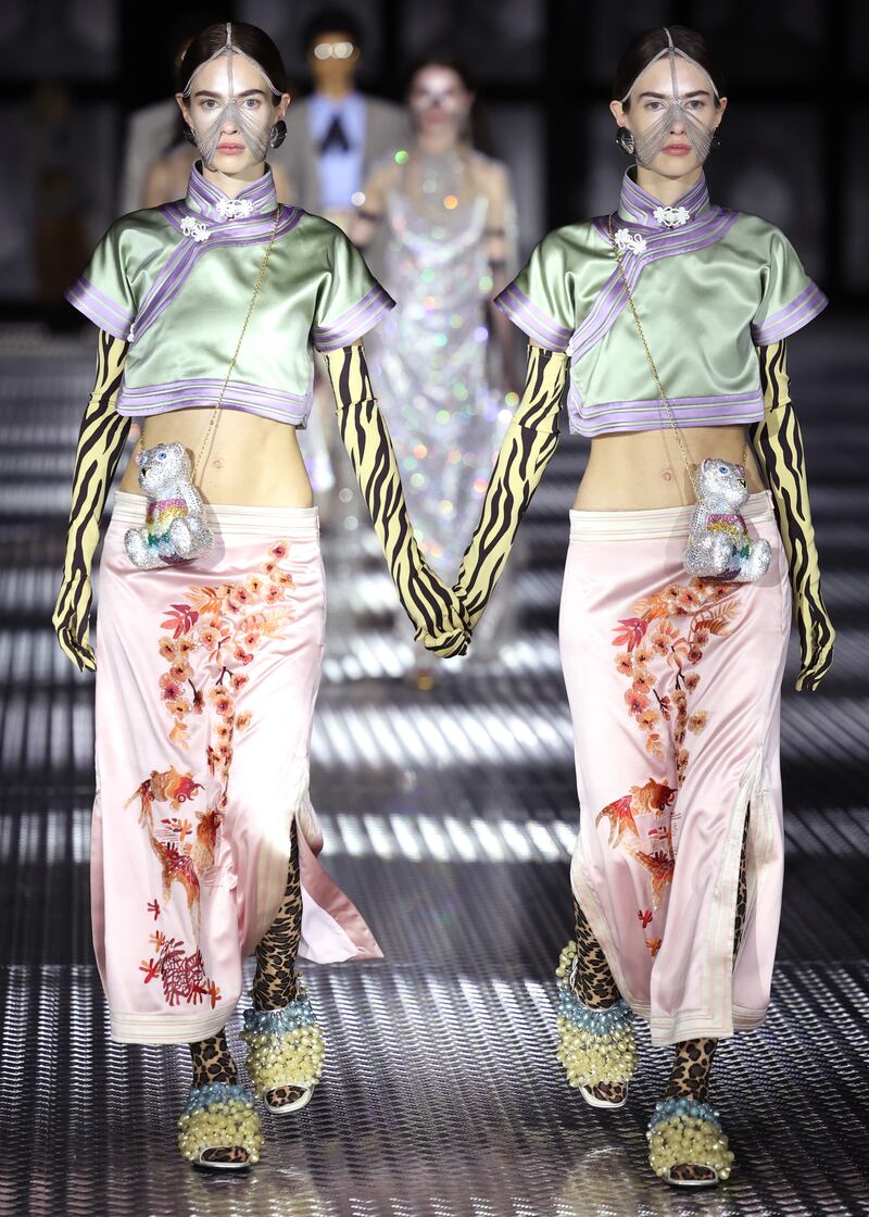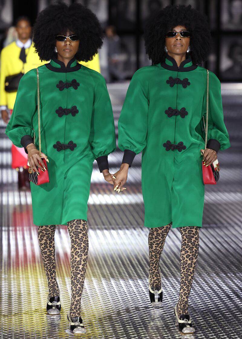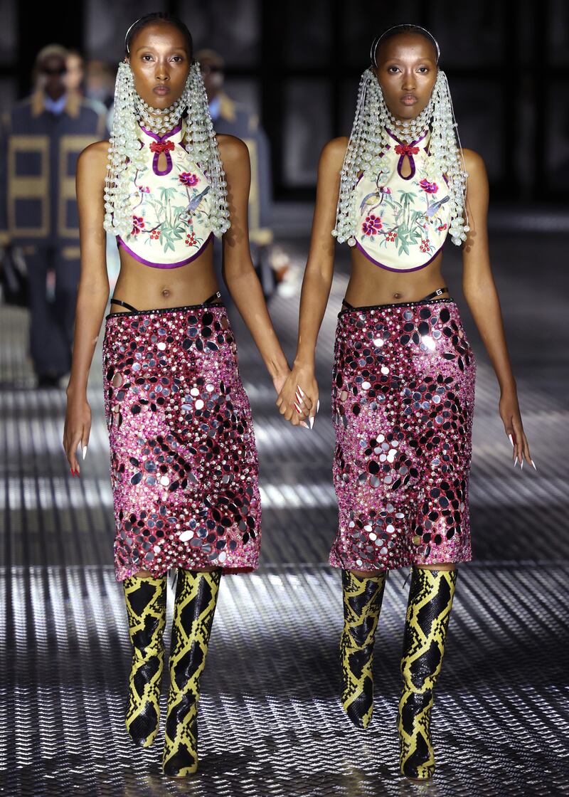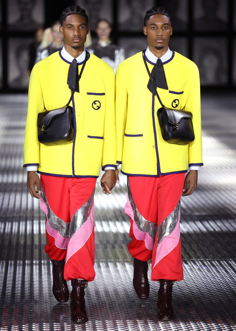 Michele, Gucci’s creative director, had a stage constructed with a secret reveal. According to The Associated Press, he staged side-by-side shows inside the Gucci Hub, each unbeknownst to the other, until a wall lifted, revealing sets of twins in similar looks in synchronic stride.