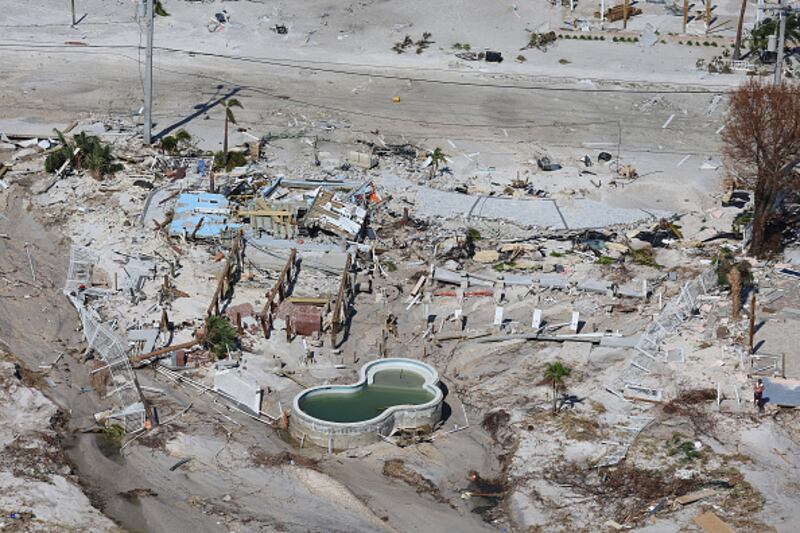 Photos: Hurricane Ian aftermath FORT MYERS BEACH,FLORIDA - SEPTEMBER 29: In an aerial view, damaged buildings are seen as Hurricane Ian passed through the area on September 29, 2022 in Fort Myers Beach, Florida. The hurricane brought high winds, storm surge and rain to the area causing severe damage. (Photo by Joe Raedle/Getty Images) (Joe Raedle/Getty Images)
