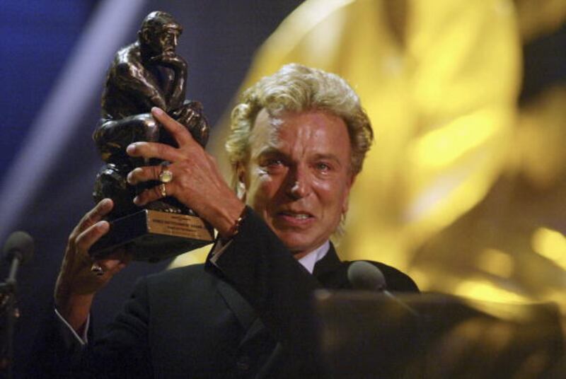 Siegfried & Roy through the years Siegfried Fischbacher waves his award during the World Awards at Hamburg's Musikhalle October 22, 2003 in Hamburg, Germany. The World Awards is an annual juried competition that presents awards each year to men who have had a positive impact on the world through social, humanitarian or philanthropic principles and who support the causes of peace, freedom and tolerance. (Photo by Pool/Getty Images) (Getty Images/Getty Images)