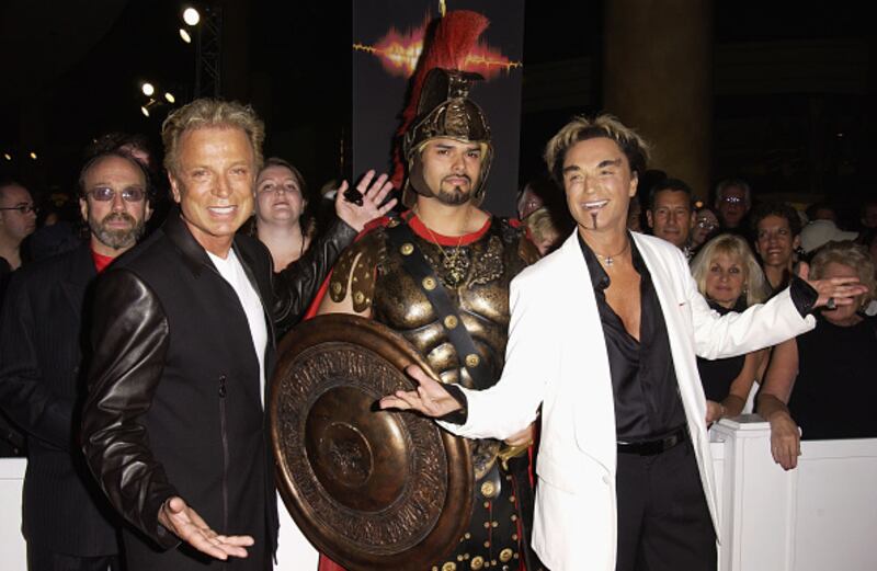 Siegfried & Roy through the years LAS VEGAS - MARCH 25: Entertainers Sigfried (R) and Roy (L) pose for a photograph with a Caesars Gladiator (M) attend the opening night performance of "Celine Dion: A New Day" at The Colosseum, Caesars Palace on March 25, 2003 in Las Vegas, Nevada. (Photo by Robert Mora/Getty Images) (Robert Mora/Getty Images)