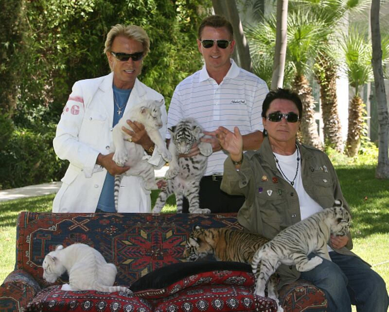 Siegfried & Roy through the years Illusionists Siegfried Fischbacher (L) and Roy Horn (R) and Mirage Hotel & Casino President Scott Sibella appear with 6-week-old tiger cubs June 12, 2008 in Las Vegas, Nevada. The cubs will take up residence at Siegfried & Roy's Secret Garden and Dolphin Habitat at The Mirage Hotel & Casino this weekend. (Photo by Ethan Miller/Getty Images) (Ethan Miller/Getty Images)