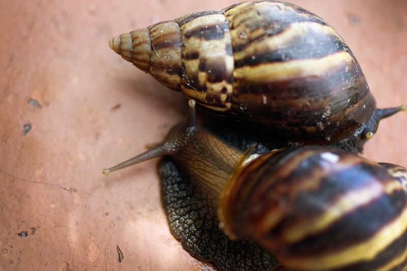 Photos: Giant African land snails The U.S. Department of Agriculture said “scientists consider the giant African snail (GAS) … to be one of the most damaging snails in the world. It is known to consume at least 500 different species of economically important agricultural plants, including breadfruit, cassava, cocoa, papaya, peanut, rubber, and most varieties of beans, peas, cucumbers, and melons, as well as plans of horticultural, cultural and medicinal value.” (Phil Mislinski/Getty Images)