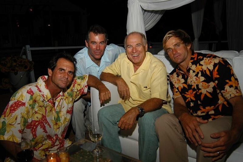 Jimmy Buffett Darrick Doener, Jeff Clark, Jimmy Buffett and Laird Hamilton attend Andrew Rosen, on behalf of Theory, Hosts a Post-Screening Dinner to Celebrate "Riding Giants" at the home of Andrew Rosen on July 2, 2004 in Southampton, New York. (Photo by Patrick McMullan/Patrick McMullan via Getty Images) (Patrick McMullan/Patrick McMullan via Getty Images)