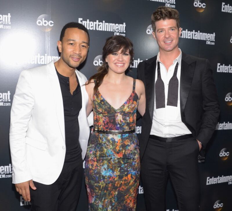 Photos: John Legend through the years 2012: Singers John Legend (left), Kelly Clarkson and Robin Thicke attend the Entertainment Weekly & ABC-TV Up Front VIP Party at Dream Downtown on May 15, 2012, in New York City. (Michael Loccisano/Getty Images)