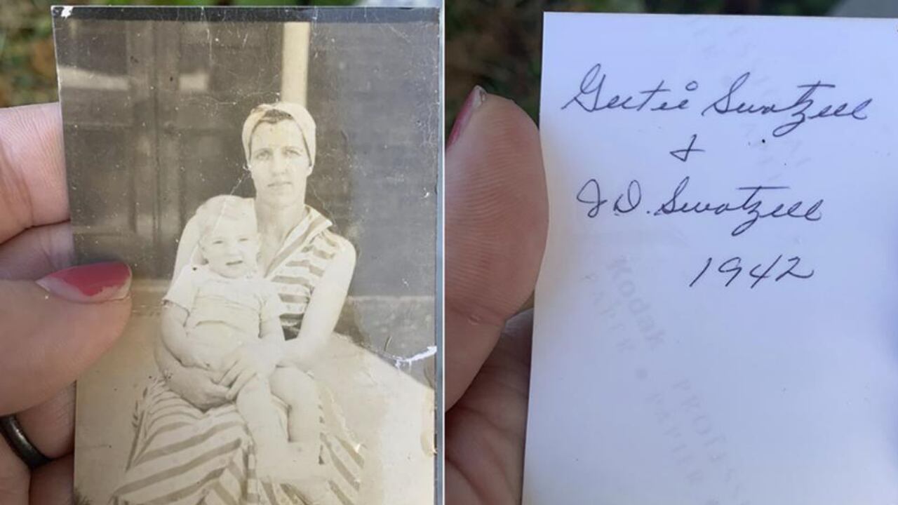 The black-and-white photo reads “Gertie Swatzell and JD Swatzell 1942″ on the back, according to WDRB-TV. The woman in the photo is wearing a headscarf and a striped sundress while holding a boy.