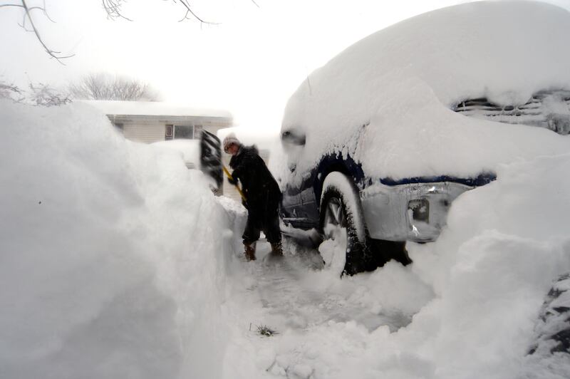 Intense Winter Storm Brings Multiple Feet Of Lake Effect Snow To Buffalo Area HAMBURG, NY - November 18: Michelle Kucalski digs out her car after an intense lake-effect snowstorm impacted the area on November 18, 2022 in Hamburg, New York. Around Buffalo and the surrounding suburbs, the snowstorm resulted in up to four feet of accumulation, and additional snowfall is forecast for the weekend. (Photo by John Normile/Getty Images) (John Normile/Getty Images)