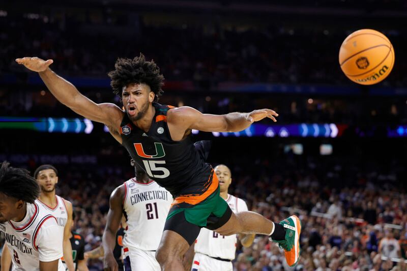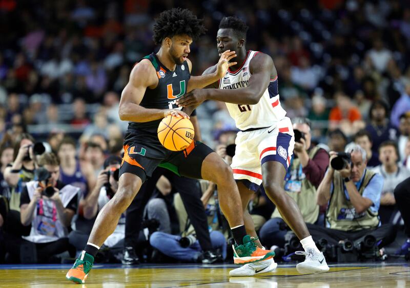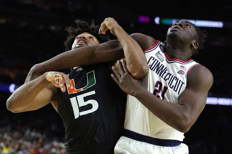 Amana Sonaga led UConn with 21 points and added 10 rebounds. Isaiah Wong led the Hurricanes in scoring with 15 points.