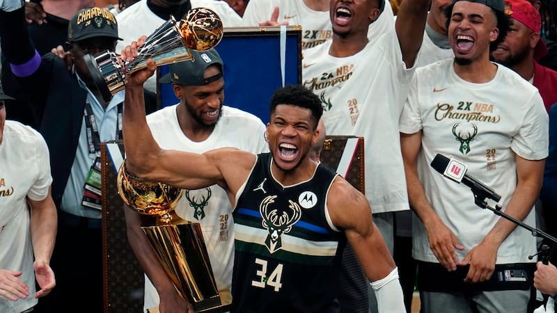 Photos: Milwaukee Bucks defeat Phoenix Suns to win NBA title Milwaukee Bucks forward Giannis Antetokounmpo (34) holds with the finals MVP trophy after the Bucks defeated the Phoenix Suns in Game 6 of basketball's NBA Finals in Milwaukee, Tuesday, July 20, 2021. The Bucks won 105-98. (AP Photo/Paul Sancya)