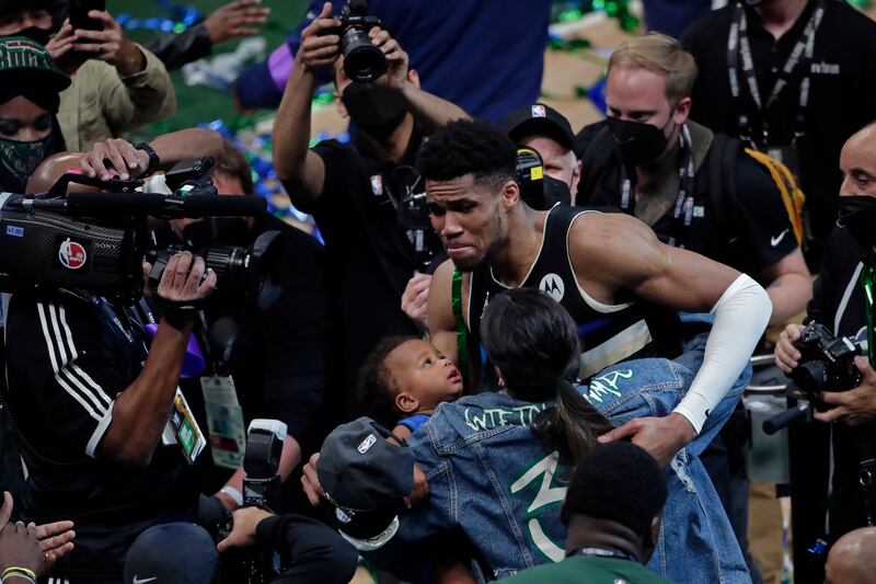 Photos: Milwaukee Bucks defeat Phoenix Suns to win NBA title Milwaukee Bucks forward Giannis Antetokounmpo hugs his girlfriend Mariah Riddlesprigger and son Liam after defeating the Phoenix Suns in Game 6 of basketball's NBA Finals Tuesday, July 20, 2021, in Milwaukee. The Bucks won 105-98. (AP Photo/Aaron Gash)