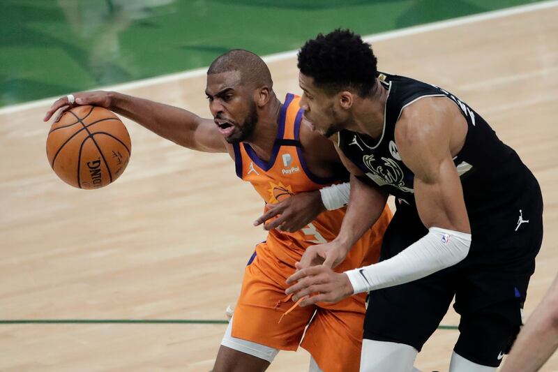Photos: Milwaukee Bucks defeat Phoenix Suns to win NBA title Phoenix Suns guard Chris Paul (3) drives to the basket against Milwaukee Bucks forward Giannis Antetokounmpo (34) during the first half of Game 6 of basketball's NBA Finals Tuesday, July 20, 2021, in Milwaukee. (AP Photo/Aaron Gash)